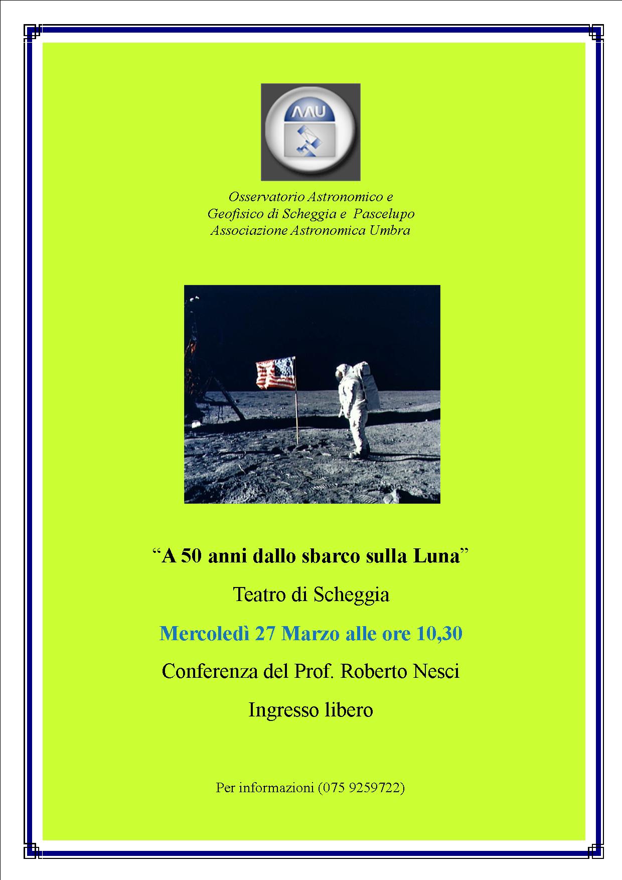Mercoledì 27 Marzo alle ore 10.30, presso il teatro comunale di Scheggia, si terrà l'evento "A 50 anni dallo sbarco sulla luna", un'occasione per celebrare insieme l'anniversario dell'allunaggio. Parteciperanno anche i ragazzi della scuola media ed elementare di Scheggia e Pascelupo. Tutti i cittadini sono invitati!