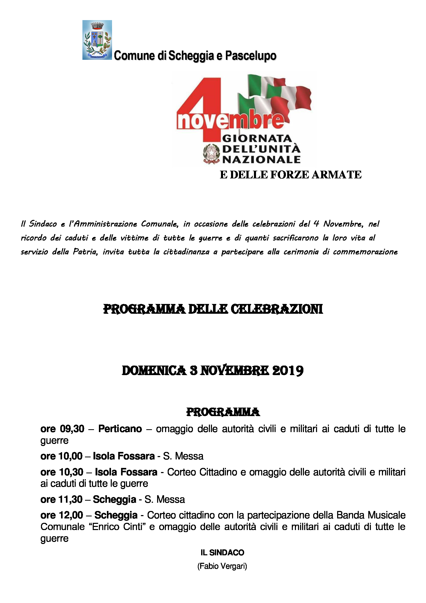 Domenica 3 Novembre 2019, si svolgeranno le celebrazioni in occasione della Giornata dell'Unità Nazionale e delle Forze Armate che ricorre il 4 Novembre.